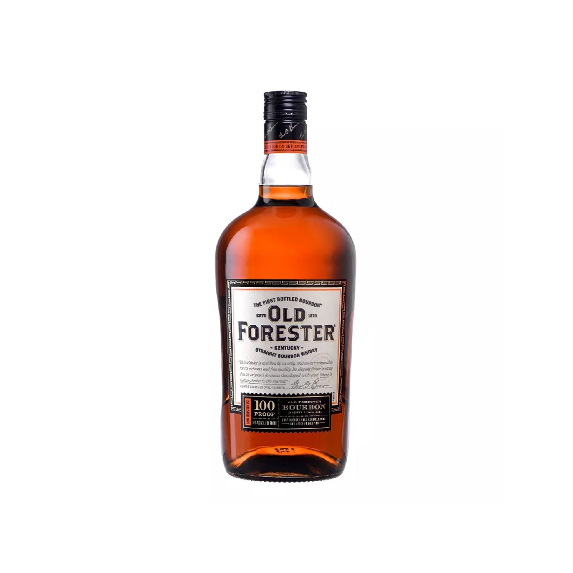 Old Forester 100 Proof Bourbon is a tribute to founder George Gavin Brown, gracing the label with his distinguished signature.